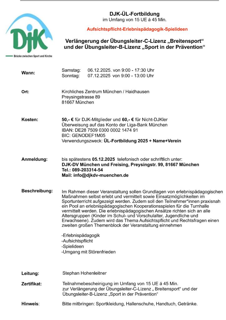 Neben den vereinseigenen Maßnahmen wollen wir auch auf ausgewählte externe Angebote hinweisen, vielfach werden diese vom DJK-Sportverband München und Freising angeboten oder von anderen DJK-Verbänden.